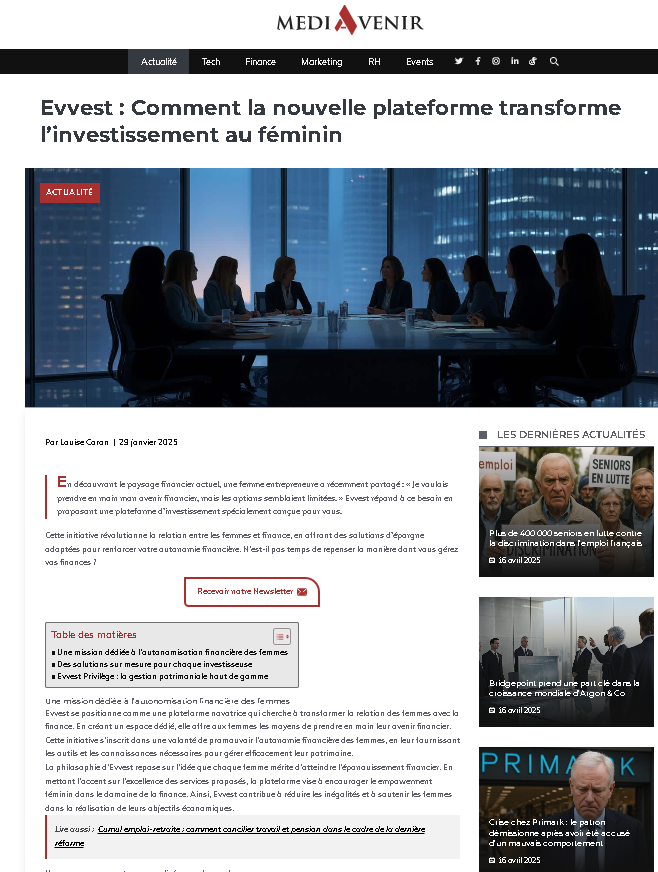 Cliquez simplement sur l’image associée à chaque article pour accéder directement à la publication concernée.Cette rubrique vous permet de suivre, en toute transparence, la reconnaissance et l’impact d’Evvest dans la presse.